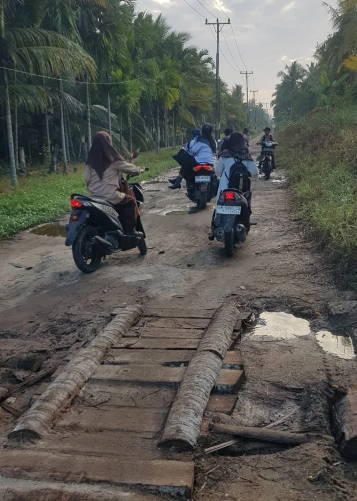 Jalan Merdeka bukan sekadar jalur penghubung antarparit. Ia adalah urat nadi bagi ratusan warga, termasuk siswa SMA Negeri 1 Gaung Anak Serka (GAS). Namun, namanya seolah bertolak belakang dengan kondisinya: rusak parah dan nyaris tak tersentuh perbaikan selama bertahun-tahun.