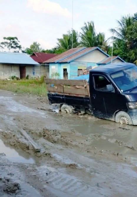 Kondisi serupa juga terlihat di desa seberang, tepatnya di wilayah Pebenaan, Parit Pelam. Sebuah mobil pick-up tampak terperosok, rodanya tenggelam dalam lumpur. Bukan karena pengemudi ceroboh, melainkan karena jalan yang tak lagi layak dilalui.