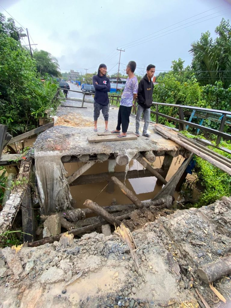 Ketika matahari mulai naik, kenyataan pahit terbentang jelas. Bagian tengah jembatan runtuh, menyisakan lubang menganga di atas aliran parit berwarna cokelat. Beton retak, kayu penopang patah, dan sisa rangka menggantung tak berdaya. Jalan yang biasanya ramai oleh langkah dan roda, kini terhenti oleh kehampaan.
